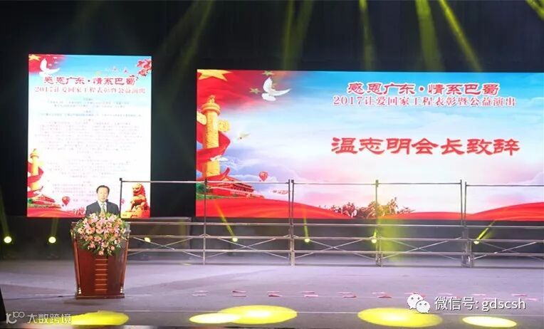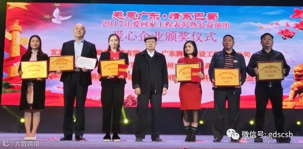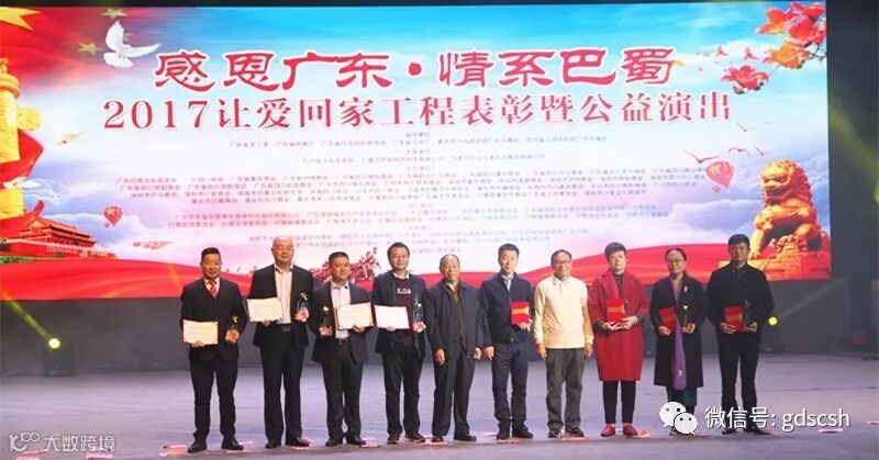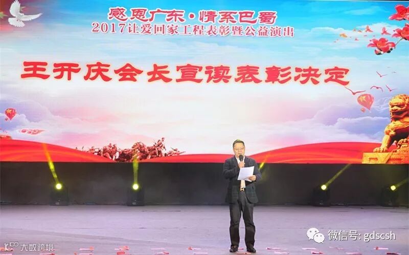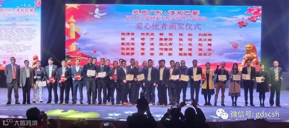 12月31日,由让爱回家工程组委会主办的“感恩广东·情系巴蜀”2017让爱回家工程表彰暨公益演出活动在广州白云国际会议中心世纪大会堂举办。(让爱回家工程组委会由广东巴蜀文化促进会联合在粤36家川渝籍商协会组成)来自省、市有关退休老领导、巴蜀籍各界人士、各大媒体约2500人、近100万线上观众共同见证了此次盛会。我会会长王开庆,理事长朱曲波,常务副会长陈建斌、黄勇、唐任高、涂志亮、付志红、周敏,副会长冯建春,会员戚磊、赵榕等会员出席了此次活动。