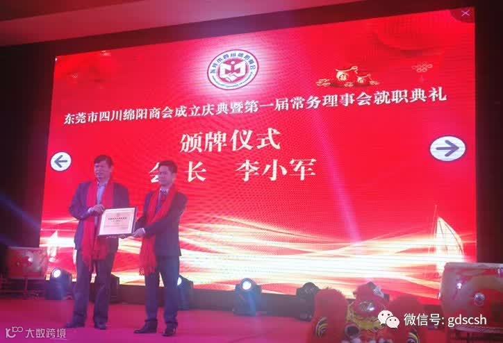 东莞市民政局领导宣读了同意成立东莞市四川绵阳商会的批复,并为商会授牌。东莞市四川绵阳商会会长李小军致欢迎词;绵阳市工商联领导致辞祝贺,并分别为会长、执行会长、监事长、常务副会长、副会长、会员颁发牌匾。庆典活动在丰富多彩的文艺节目表演中落下帷幕。