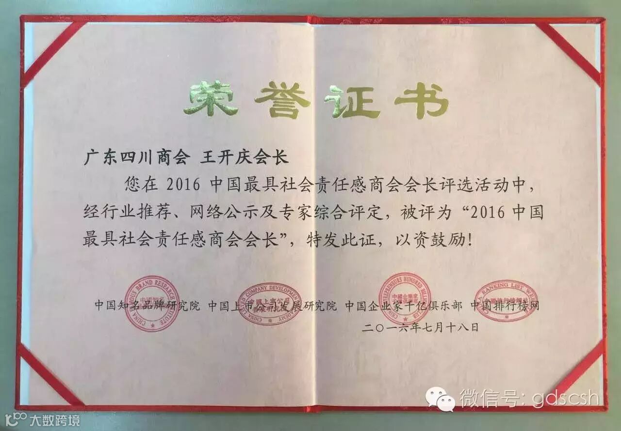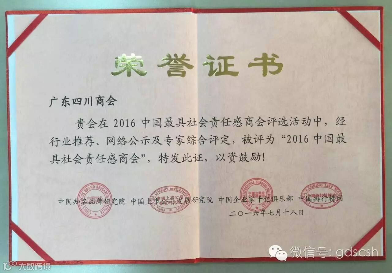 广东四川商会7月18日,我会受邀参加由中国知名品牌研究院、中国上市公司发展研究院主办的“中国投资合作交流会”在广东迎宾馆隆重召开及颁发荣誉证书。会上,广东四川商会荣获“2016中国最具社会责任感商会”称号,王开庆会长荣获“2016中国最具社会责任感商会会长”称号,何扬宇秘书长荣获“2016中国驻粤商会优秀秘书长"称号。