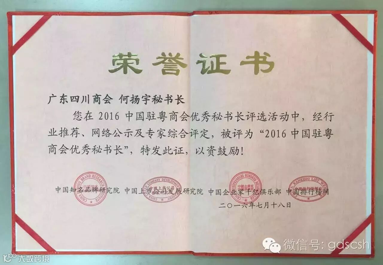 何扬宇秘书长荣誉证书
