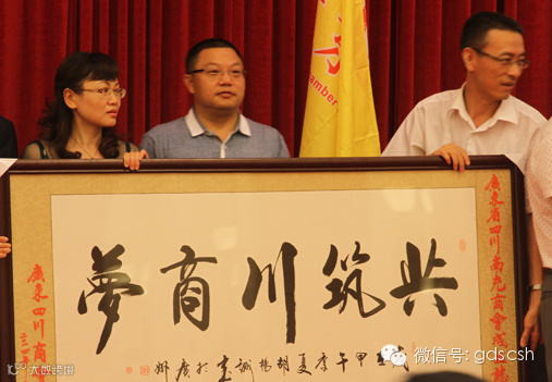 常务副会长陈建斌代表我会向广东省四川南充商会赠送了由书法家杨诚撰写的“共筑川商梦”牌匾。我会红木分会会长也上台向戈顿会长赠送了紫檀木笔筒,致以祝贺。