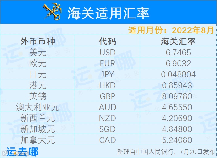 8月海关适用汇率公布
