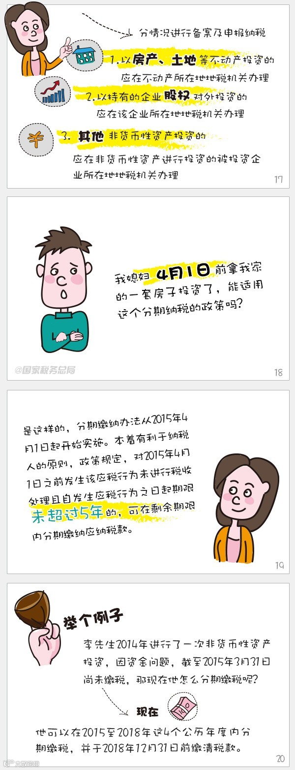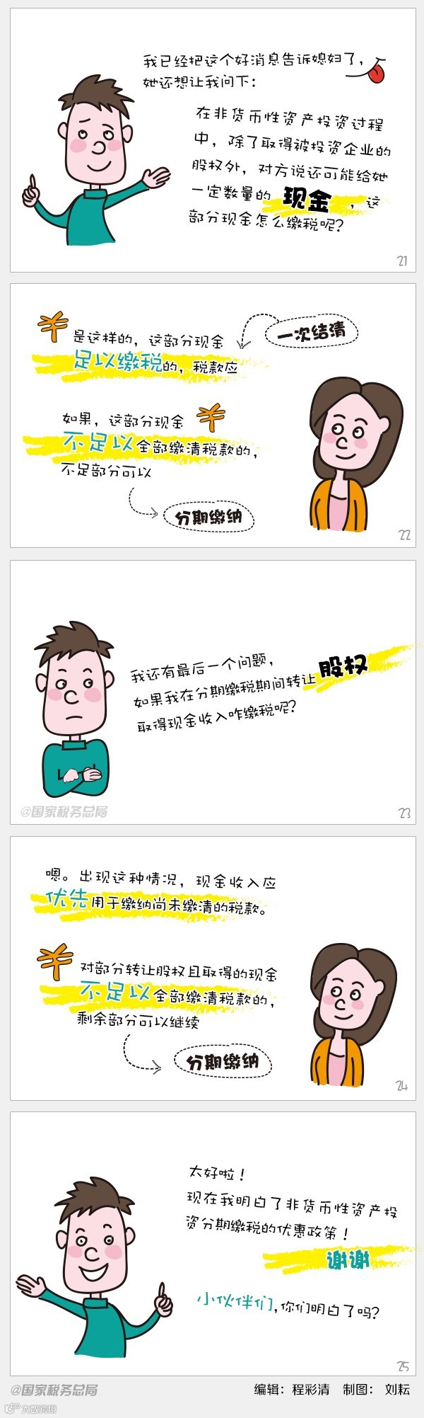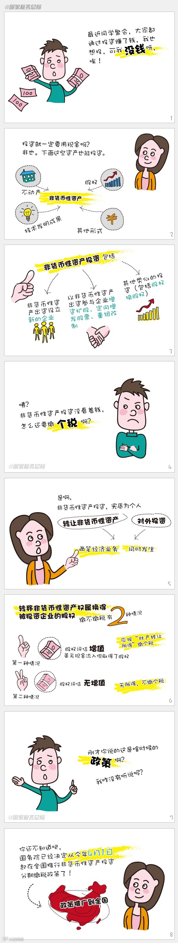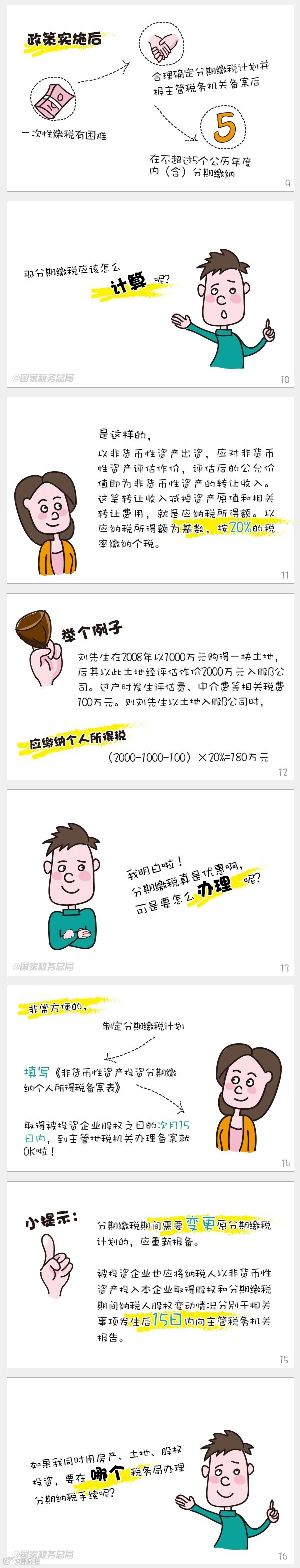 个人非货币性资产投资分期缴税政策旨在减轻投资人当期税收负担,促进大众创业、万众创新,那么,什么是个人非货币性投资?分期缴税在实践中应如何操作,25张漫画让你读懂↓