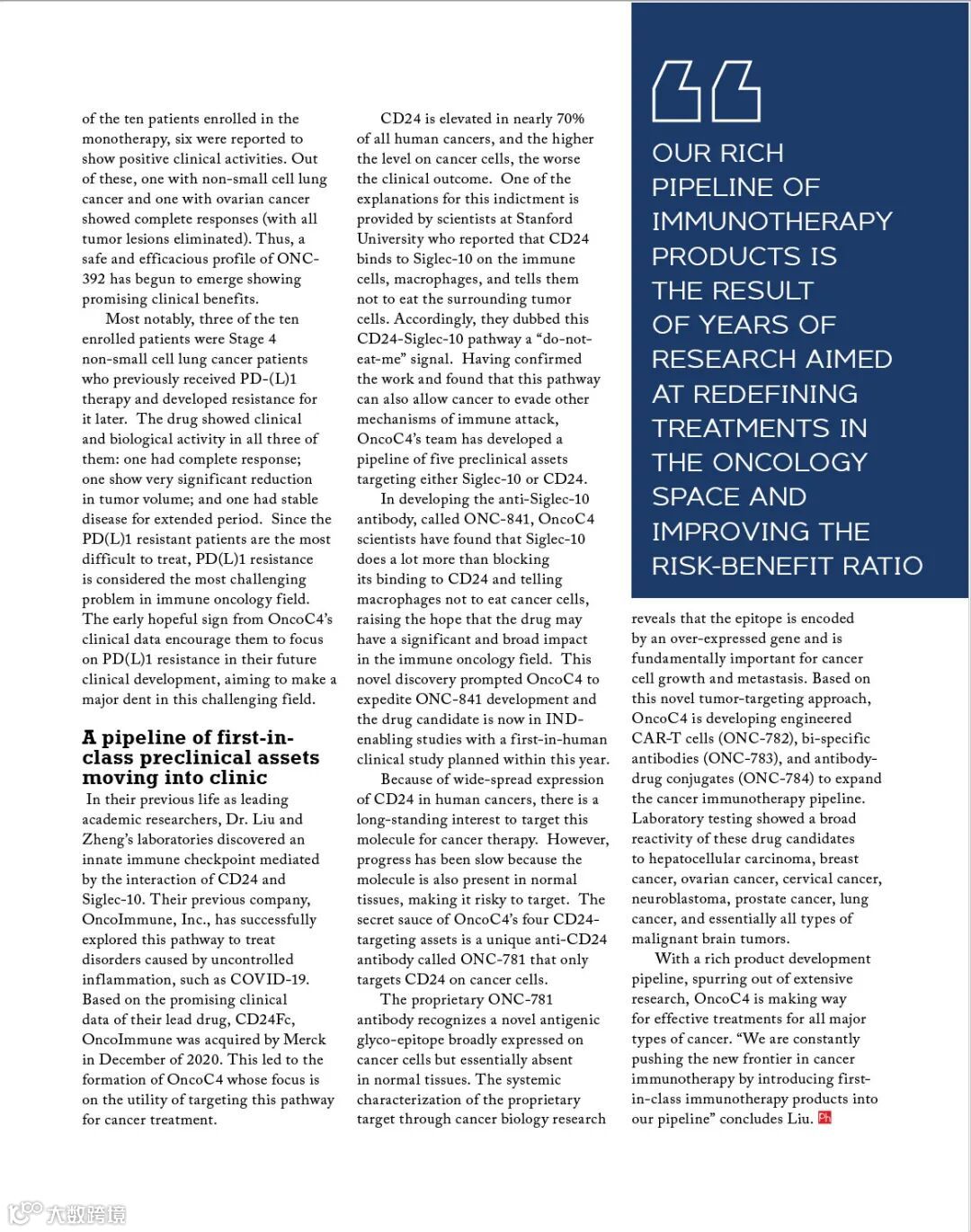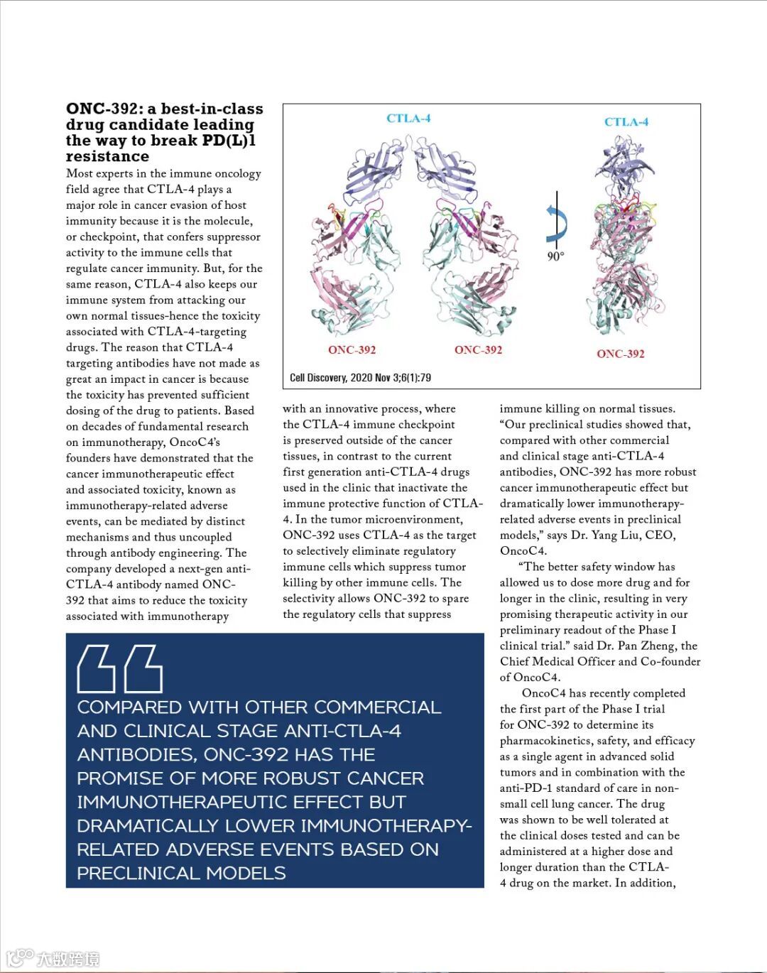 OncoC4是昂科免疫创始人刘阳、郑盼教授在2020年OncoImmune公司被默沙东宣布收购后拆分成立的新公司,OncoC4保留了除CD24Fc之外的资产,并获得了默沙东的注资以促进其肿瘤免疫管线研发。作为OncoC4领先的临床候选药物,ONC-392是新一代抗CTLA-4抗体,可使CTLA-4分子得以循环使用,并维持其对自身免疫性疾病的保护功能,同时增强抗肿瘤效果。此外,OncoC4还拥有一条以CD24-Siglecs癌症免疫逃逸途径为重点的first-in-class临床前产品管线。