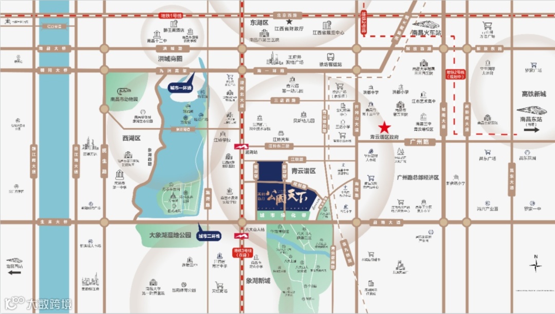 现在南昌环线结构已经形成。根据城市发展规律,一环线内通常是商业政治中心,人流多,繁华但居住体验差。而一环外、二环附近的自然生态地段才是宜居板块,因为这里既能通过环线快速抵达各大政商中心,又能远离高楼大厦,亲近自然。