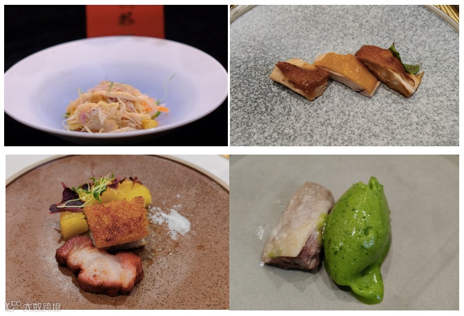 前菜中的白切粤贡凰、盐焗土香鸡,取自温氏佳味功夫熟鸡系列的白切和盐焗两款产品,简单配合料汁,就将两大经典粤系菜美食的风味体现到淋漓尽致。文化学者&文艺评论家江冰给出高度评价:“温氏佳味传统粤菜头牌白切鸡,呈现方式创新:每盘一块鸡肉,佐配一团绿色葱姜味冰淇淋——姜葱汁加菠菜汁,再低温处理成冰淇淋,极有新鲜感,让白切鸡焕然一新;‘温氏佳味盐焗鸡+顺德捞起方式+土榨花生油’的结合非常绝妙,将配料芝麻花生碎,洒到鸡丝之上,味道风味上佳”。