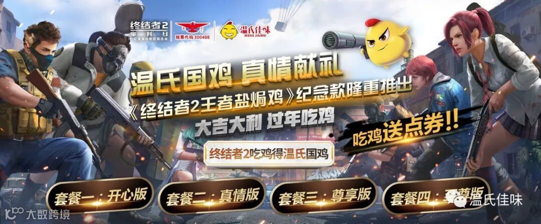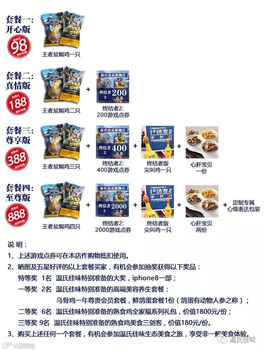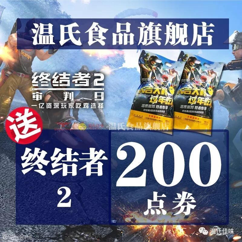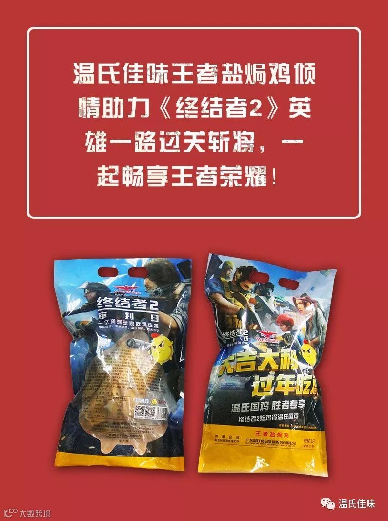 《终结者2》各路玩家可通过天猫,进入“温氏食品旗舰店”一睹她的“芳容”,并解解口馋。温氏《终结者2王者盐焗鸡》,味道鲜美,营养丰富,以“供港品质”的高标准,专门为庆祝《终结者2》王者凯旋归来而制,专门为玩家们镌刻一个属于《终结者2》迷的共同记忆。