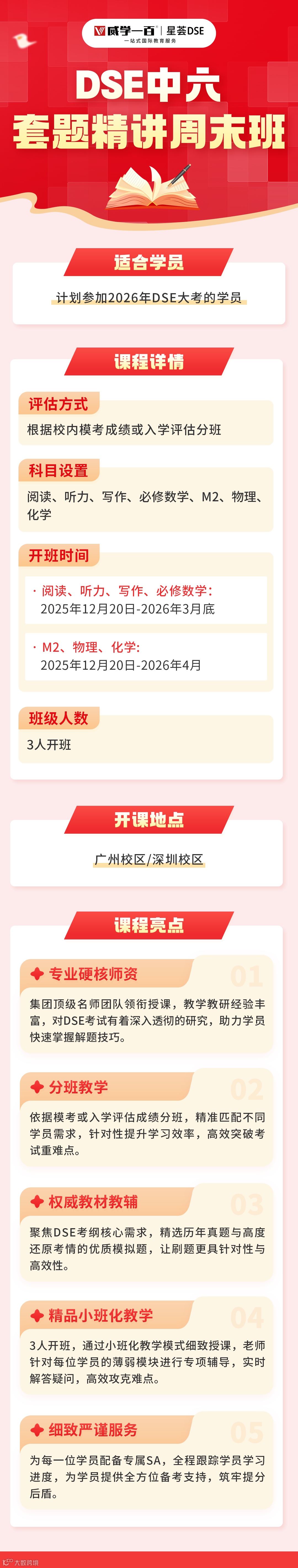 2026年DSE考试备考已进入决胜关键阶段,时间分秒必争。想在有限时间内实现分数跨越式提升,精准突破薄弱科目,牢牢掌握核心考点?威学一百专为中六考生量身打造了DSE中六套题精讲周末班,2025年12月20日开课,3人开班!