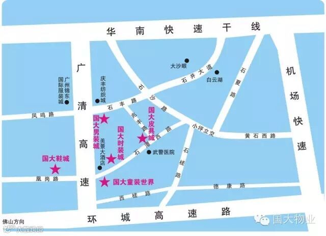 广州市白云区石井镇石井街石潭西路2号国大童装世界(美景大酒店旁)