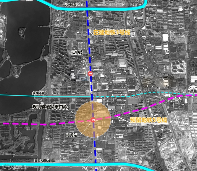 象湖东岸相对于洪都新城来讲,交通格局更顺畅,南北两条快速路,东西轴向规划为隧道联通了广州路与朝阳新城,中部在建地铁3号线,还预留了5号线通道和轨道换乘中心,整个区域的交通格局十分立体。