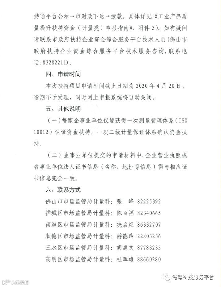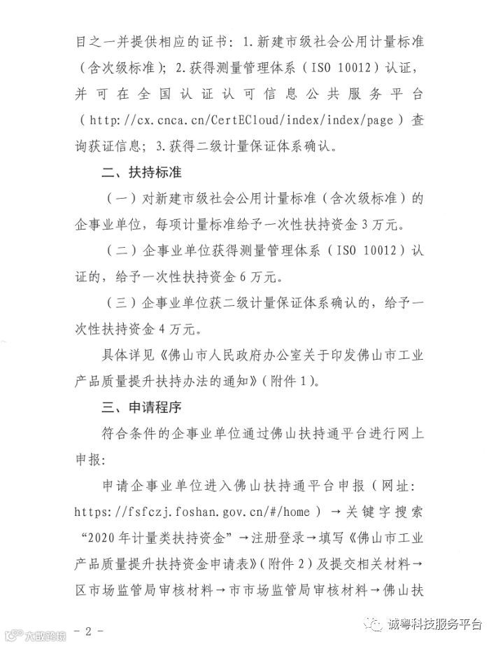 网上申报:申请单位进入佛山扶持通申报→关键字搜索“2020年计量类扶持资金”→注册登录→填写《佛山市工业产品质量提升扶持资金申请表》(加盖单位公章扫描上传)及提交相关材料(加盖单位公章扫描上传)→区市场监管局经办科室审核材料(下载申请单位上传的《佛山市工业产品质量提升扶持资金申请表》,提交审核意见并加盖局公章扫描上传)→市市场监督管理局审核材料→佛山扶持通平台公示→市财政下达→拨款→结束。