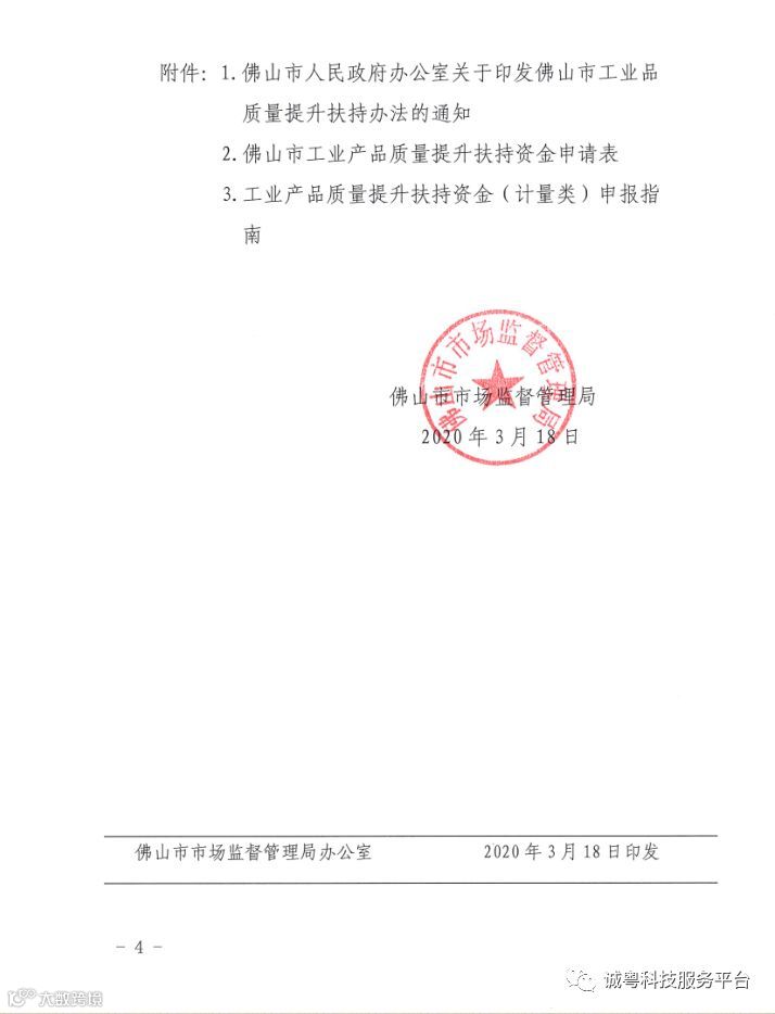 网上申报:申请单位进入佛山扶持通申报→关键字搜索“2020年计量类扶持资金”→注册登录→填写《佛山市工业产品质量提升扶持资金申请表》(加盖单位公章扫描上传)及提交相关材料(加盖单位公章扫描上传)→市市场监督管理局审核材料→佛山扶持通平台公示→市财政下达→拨款→结束。