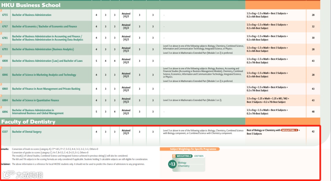 根据之前港大牙医联招收生数据,收生分数中位数为46(权重后)。假设学生的生物或者化学科目达到了5**(即加权后的11分),剩下的5科成绩也至少需要35分。按照港大的计分制来算,也就是平均每科5*才有希望入读港大牙医。即港大牙医DSE最好的6科成绩=1个5**+5个5*。