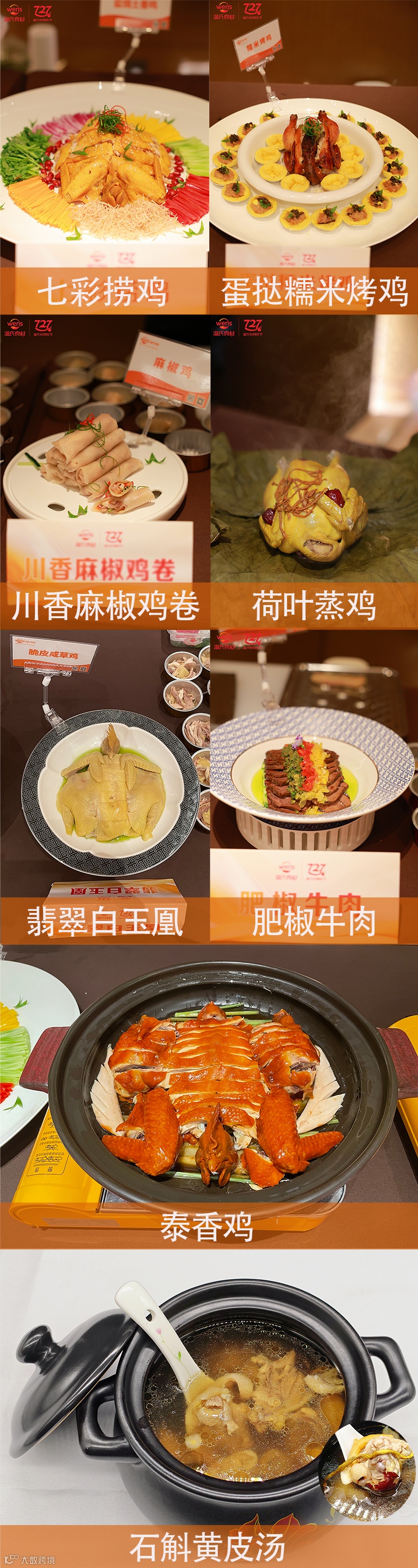 温氏佳味研销中心精选功夫盐焗鸡、麻椒鸡、豉油鸡、脆皮鸡、酱香牛腱肉等核心产品,匠心转化为八道风味佳肴呈献来宾,包括七彩捞鸡、蛋挞糯米烤鸡、川香麻椒鸡卷、荷叶蒸鸡、翡翠白玉凰、泰香鸡、肥椒牛肉、石斛黄皮汤。来宾在品鉴交流中,对产品转化潜力表现出浓厚兴趣,纷纷表达了深入了解与深度合作的意向。