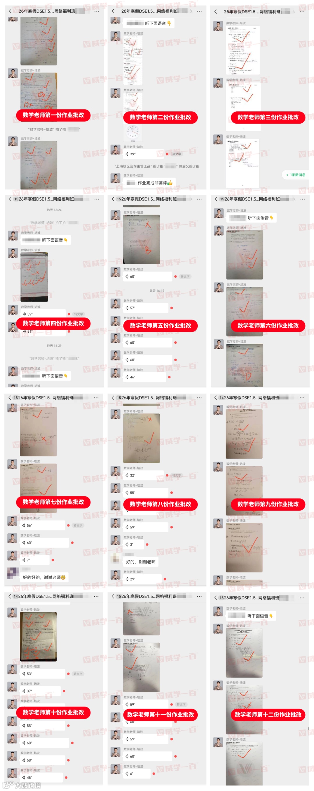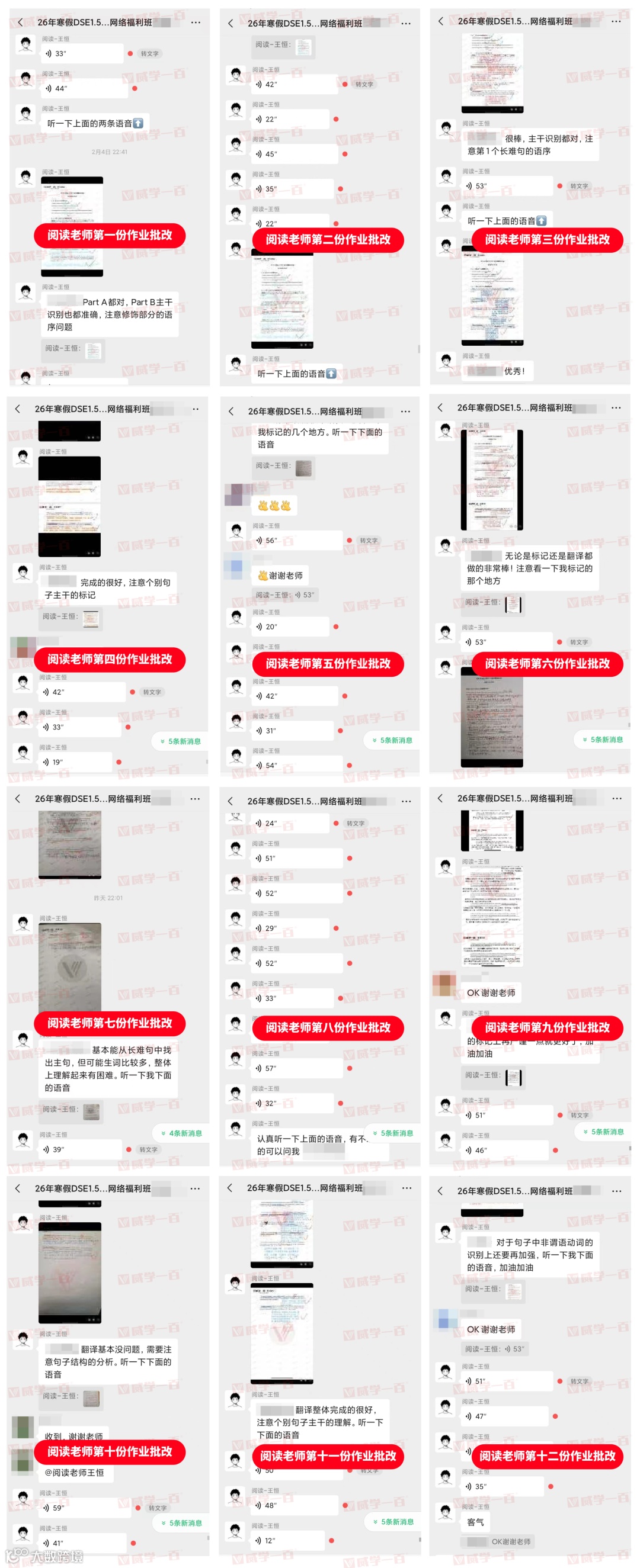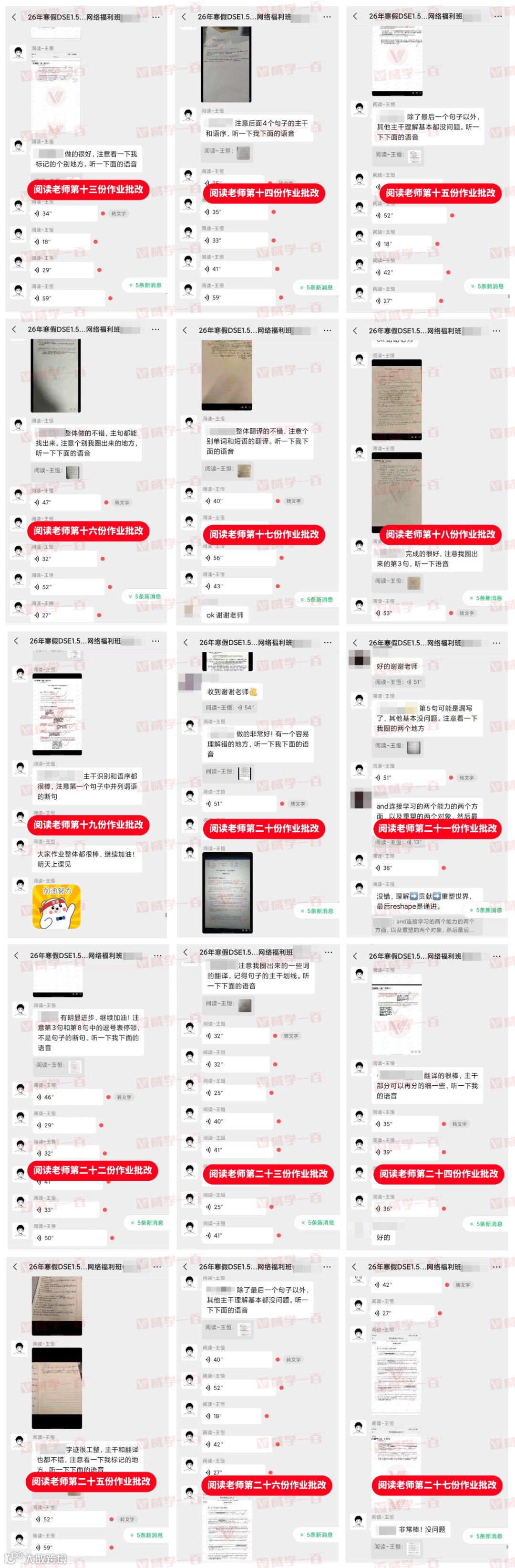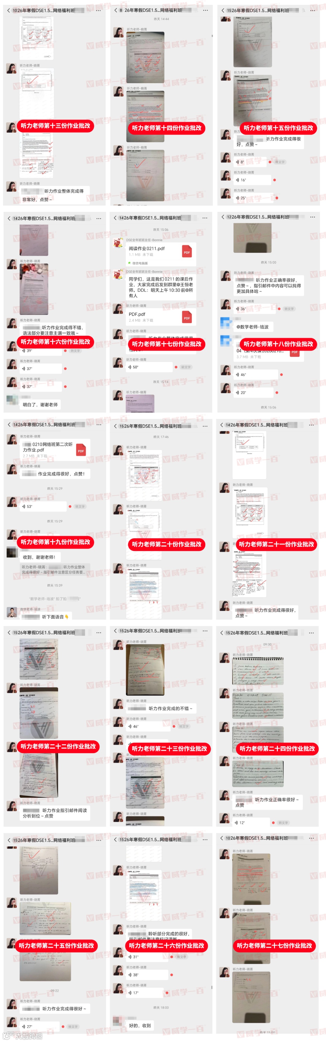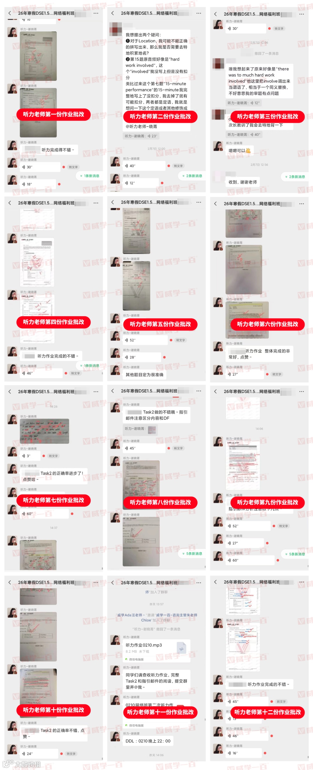 学员提交作业后,各科老师都会逐一批改,不放过任何一个细小的错误,无论是阅读答题逻辑的偏差、听力答案的疏漏,还是数学解题步骤的不完整,都会逐一标注、详细讲解。并在群内发送作业批改情况,同时附上细致的语音点评,让每一位学员都能明确自身不足、及时改进。