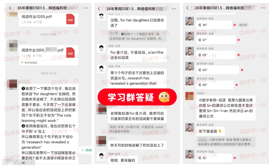 我们的专属班课群,不仅是服务通知群,更是同学们的“答疑阵地”。同学们在学习过程中,无论是课堂上没听懂的知识点、作业中遇到的难题,还是备考相关的疑问,都可以随时在群内提问。