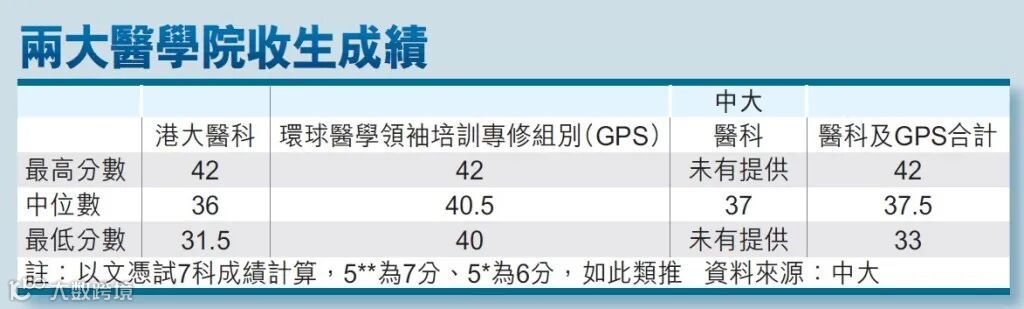这些医科的分数要求很高,大概为6科平均5*左右。今年两大医学院收生成绩,仍是港中文优于港大。以42分满分计算,港中文内外全科医学士和GPS的收生中位分数,最佳六科为37.5分,港大则为36分。