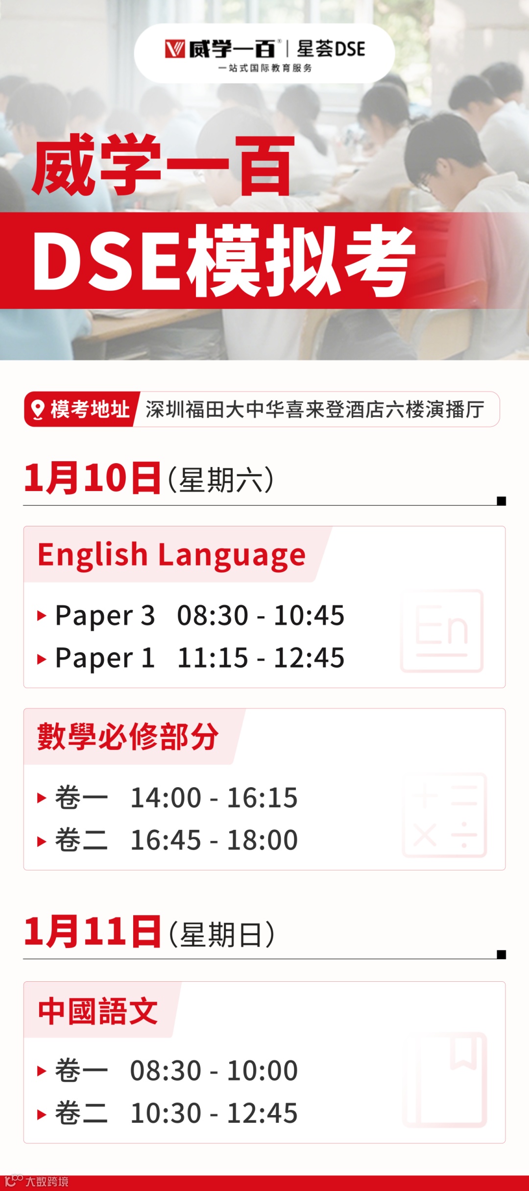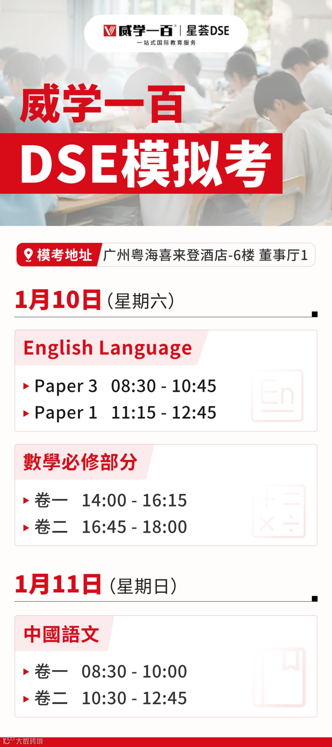 为进一步助力考生巩固提升、精准冲刺,威学一百2026 DSE第二次香港统考即将于1月10日-11日在广州粤海喜来登酒店、深圳福田大中华喜来登酒店两大考场同步开考!这场高度贴近真实大考的实战试炼,能帮助考生摸清备考实力、找准冲刺方向、稳住应考心态,让后续备考少走弯路、高效提升!