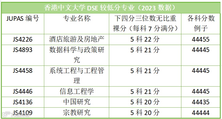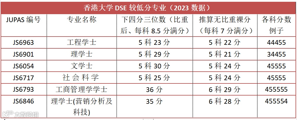 以上是23年的数据,推测24年应该也差不了太多。需要注意的是,各专业对DSE的计分比重是不一样的,例如很多专业对数学有权重,只要数学好,其他科低分一些也能进。