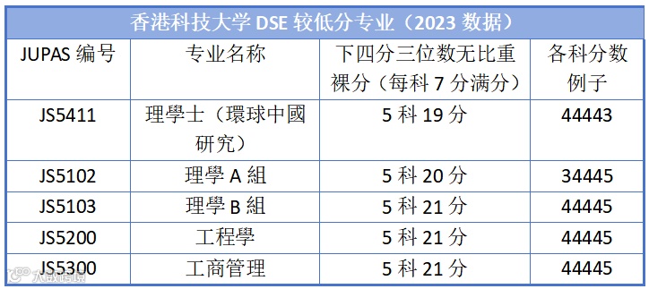 香港科技大学因为去年整体的DSE分数线下降,商科大类工商管理只需要5科21分(未记比重)就能考进、而理学A组甚至只需要5科20分左右,对纯理科的考生较为友好,都是值得考虑的专业。