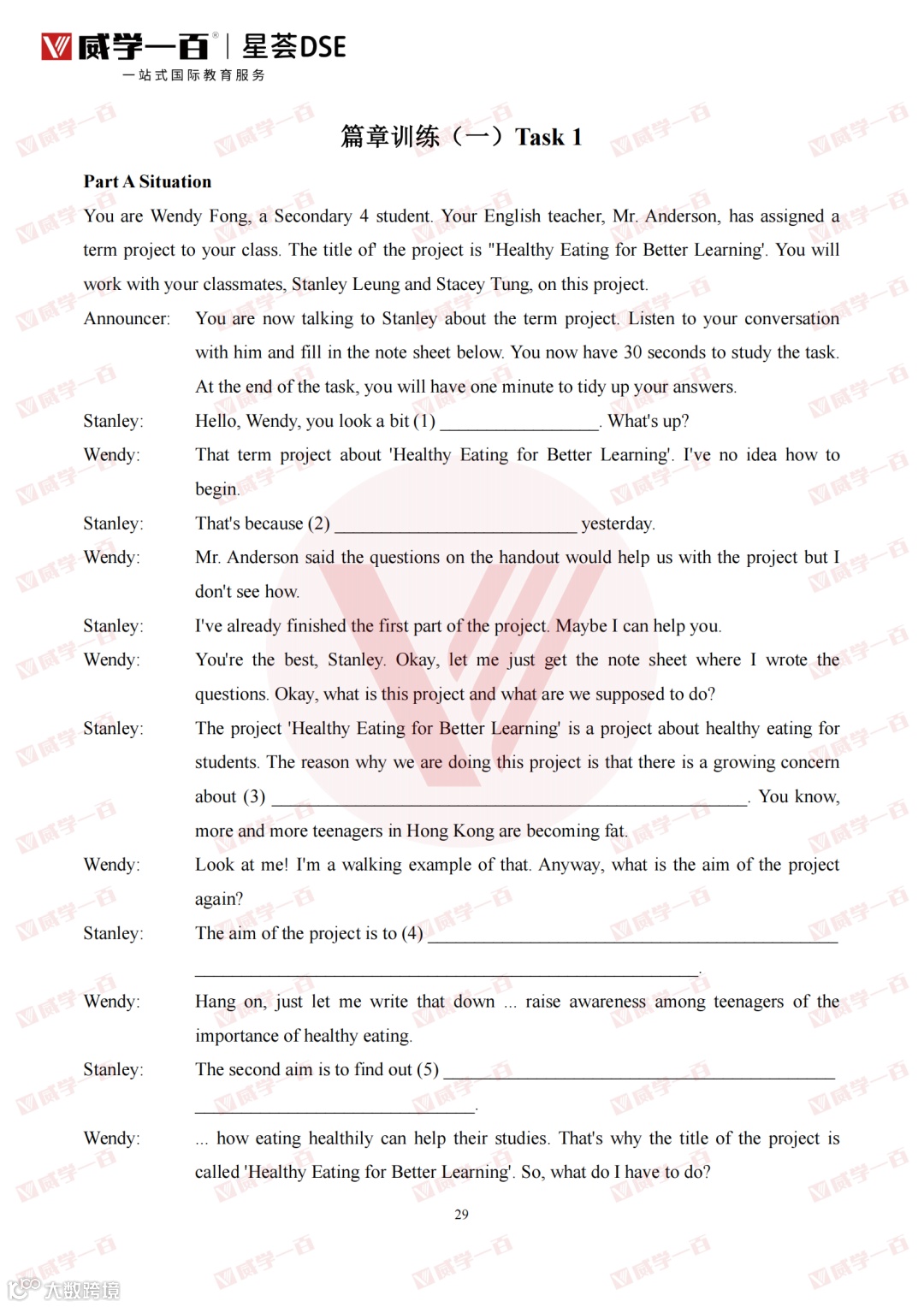 为破解Part B综合任务的得分难题,教研团队系统拆解“听-读-写”全流程,先传授高效读取任务邮件锚定核心需求的技巧,再专项练习信息筛选与整合能力,最后适配email、report等高频文本规范写作方法。每一步都直击Task核心,帮助学生理清答题要求、识别段落结构、提升阅读效率。配套作业纸聚焦四大技巧训练,含信息标记、整合及Task写作模块,同步搭配Part B练习强化听力能力,让学生按流程解题,Part B得分率稳步提升,DSE英文冲3更稳!