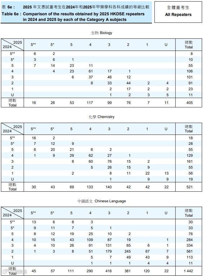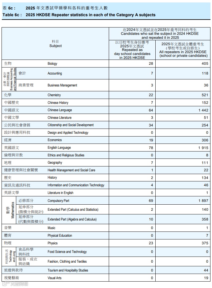 那么,这些重考DSE的同学中,哪些科目的重考人数最多?表现如何?下面我们一起看看~