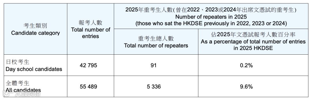 近日,香港考评局发布了2025年中学文凭试报告,在55,489名考生中,有5,336名重考生,占9.6%。其中, 90人核心科目及选修科目成绩达标。
