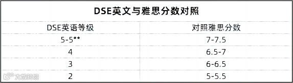 从上图我们可以得知:DSE英文科考5**的人都有雅思8分,DSE英文科合格的人都有雅思6分,是非常接近现实情况的转换。从上可见,想考DSE英语4分就要雅思7分,想考5分以上就要雅思7.5或更高。