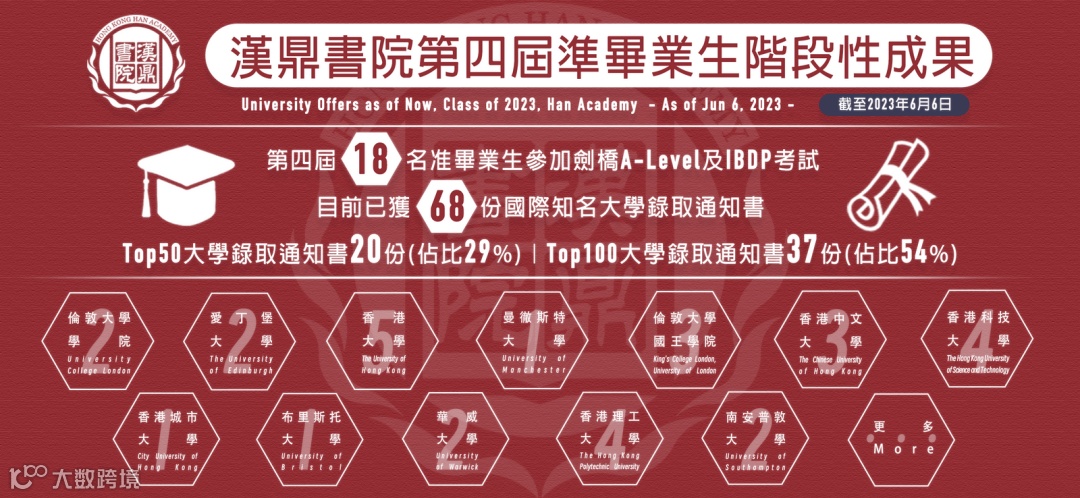 汉鼎书院成立的时间很短,但是成绩却非常傲人,根据官方公布最新数据,汉鼎23届毕业生共收到了68份国际知名大学Offer,其中29%的毕业生获得世界Top50的大学录取通知,54%的毕业生收到了世界Top100的大学录取通知,其中包括伦敦大学学院、爱丁堡大学、曼彻斯特大学、香港大学等知名学府。