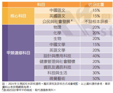 根据新学制中期检讨的建议,由2019年文凭试起,14个甲类科目会推行校本评核,部分科目的校本评核要求亦已精简,希望在学生学习利益与师生工作量之间取得平衡。
