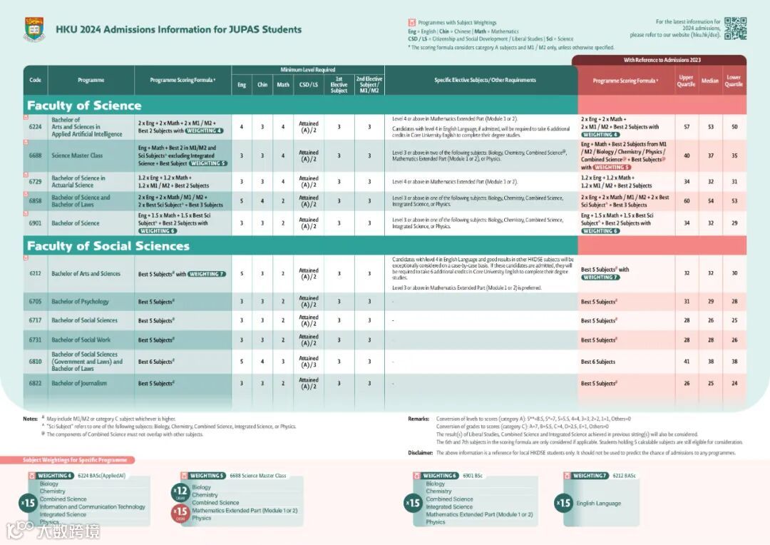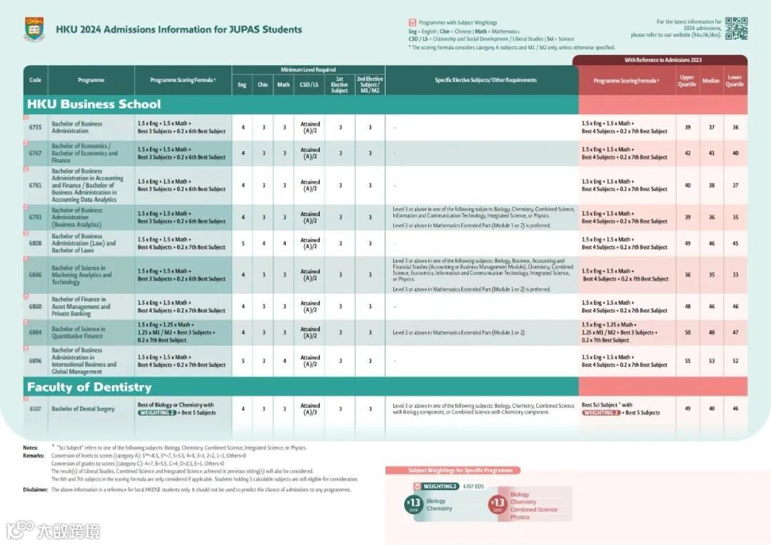 注意:换算成裸分的话中英数通+两门选修的455555*至455554的水平,平均每科有5分左右。另外注意港大商科必须DSE英文科达4分。