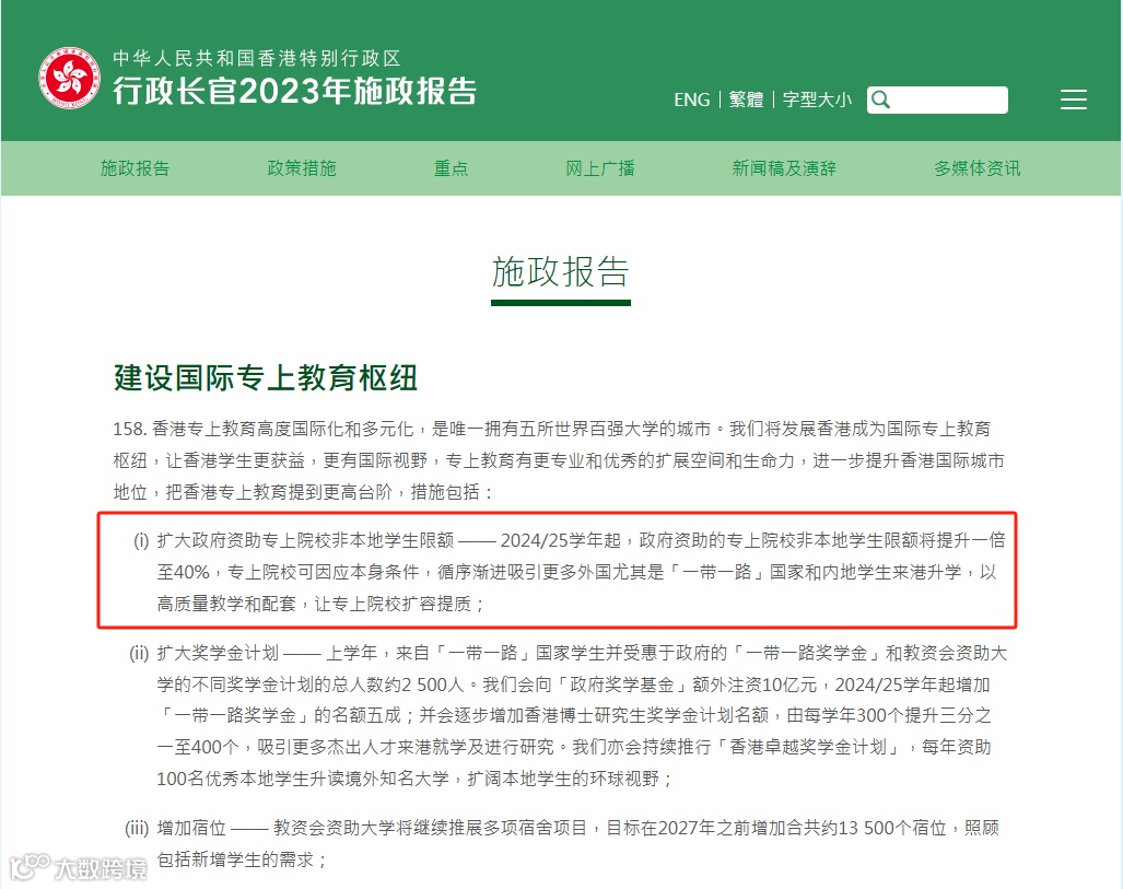 虽然说去年港府宣布2024/25学年起,政府资助的专上院校非港籍生(非本地学生)限额将提升一倍至40%。从3000个涨到6000个名额,但相比起港籍生(本地生)有15000个名额,非港籍生的名额还是比较少。