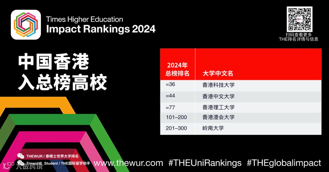 中国香港有五所高校上榜,比去年增加三所。香港科技大学在总榜中排名全球并列第 36 位。香港大学在可持续发展目标 4(优质教育)方面表现最好,香港浸会大学排名世界第二,香港理工大学排名世界第四。