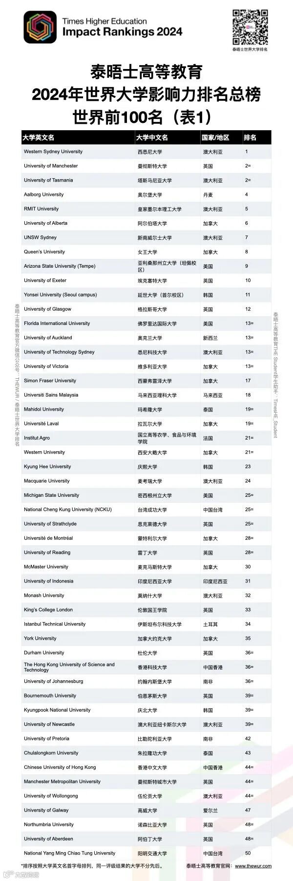 今天,泰晤士高等教育(简称THE)发布了2024年度世界大学影响力排名。