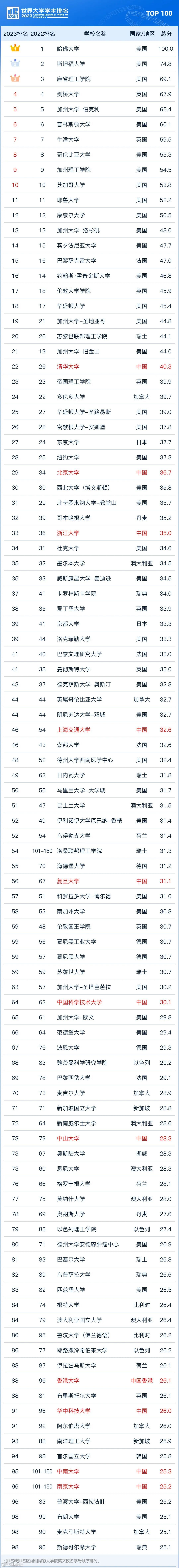 2023 ARWU的TOP 13与2022年顺序一致,其中11所大学位于美国,TOP3依次为大众所熟知的哈佛大学、斯坦福大学、麻省理工学院。