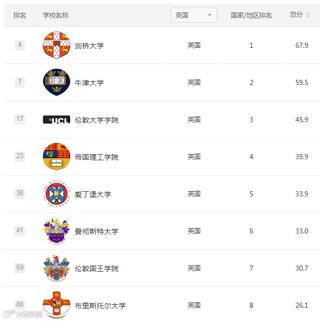 本次排名英国共有8所大学进入TOP 100,G5院校中四所进入Top20,依次为剑桥大学(Top 4)、牛津大学(Top 7)、帝国理工学院(Top 23)、伦敦大学学院(Top 17)。
