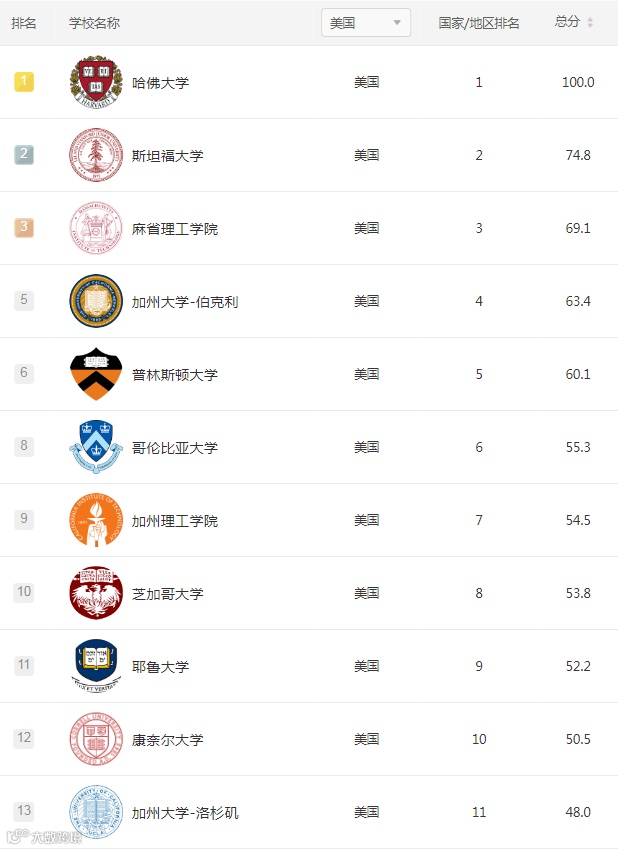 加州系两所大学稳定输出,依次为全球第5名加州大学-伯克利、全球第13名加州大学-洛杉矶。