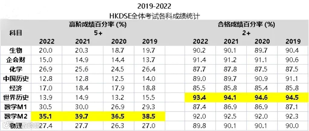 由此我们可以看出,DSE每年的合格以及优秀的人数比例是比较稳定的。其中,近4年最容易合格的是世界历史,最容易拿到优秀等级的则是数学M2。