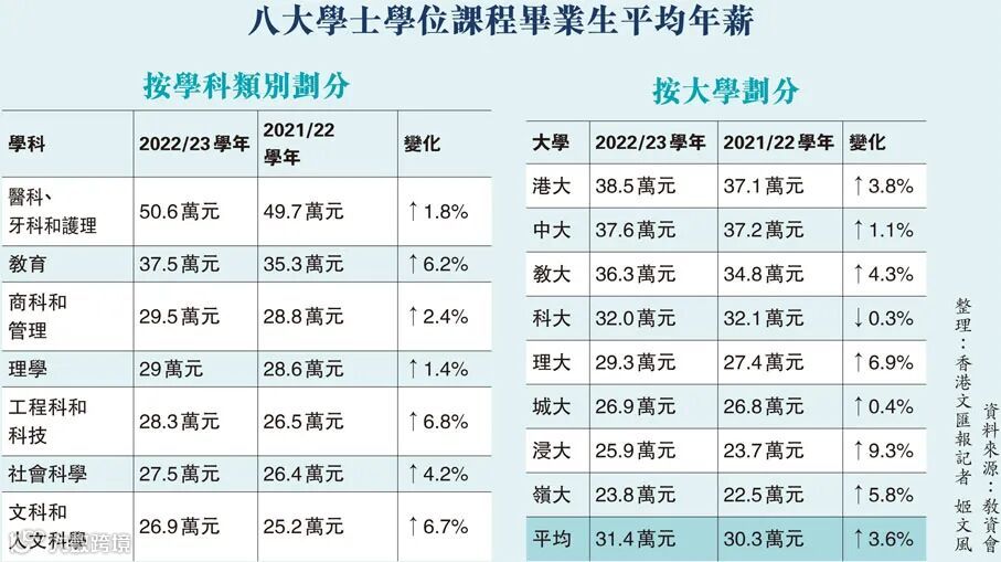 教资会的调查显示,香港八大学士学位课程毕业生平均年薪从2021/22学年的30.3万元稳步上升至2022/23学年的31.4万元,即月入的2.6万元+,较之前一年升3.6%。