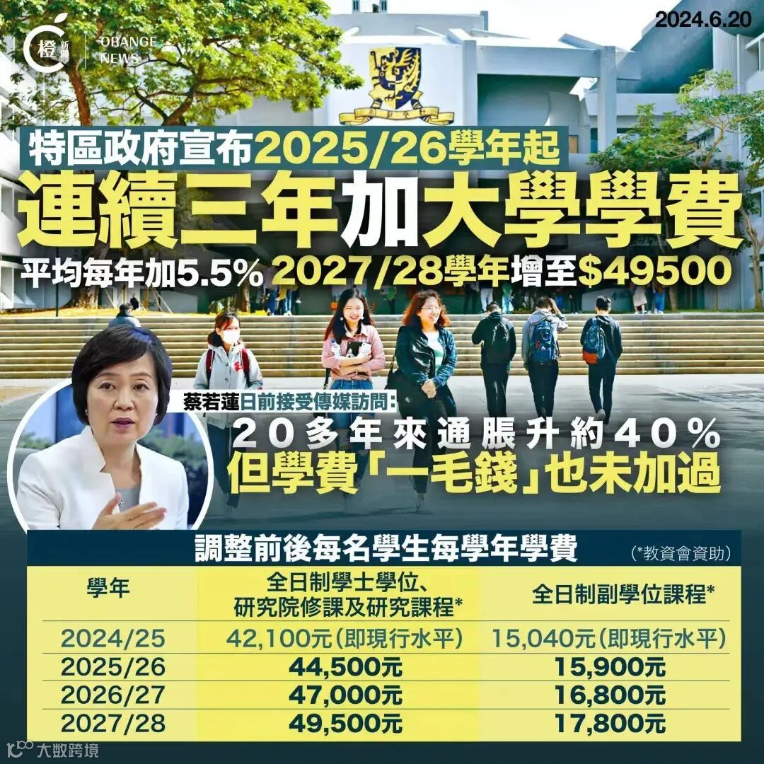 香港政府公布:“由大学教育资助委员会(教资委)资助的课程学费将从2025至26学年到2027至28学年逐年提高,三个学年平均每年增加5.5%”。这也是1997年以来首度调涨。