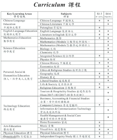 学校提供多元化的课程组合及共同能力的培训,以切合学生的不同能力、需要和兴趣。学生可以接受良好的初中基础教育,在高中时再修习四个核心科目(英国语文、中国语文、数学和通识教育),及在科学教育、人文教育、科技教育和艺术教育等学习领域中选修三科。