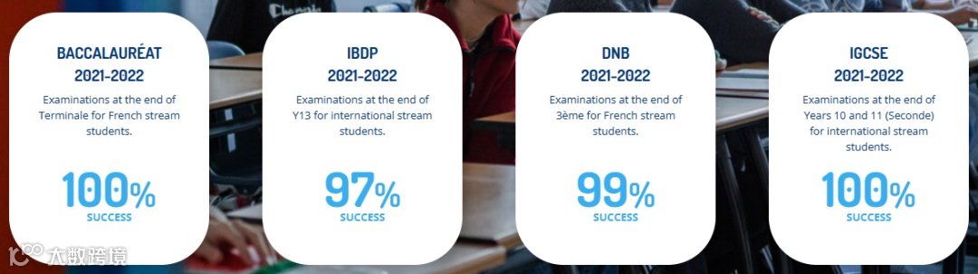 在2021-2022学年IBDP的总体平均分达到37.4分,其中33%的学生获得40分或以上的分数,而13年级结束时国际部学生考试的通过率为97%;在2021-2022学年IGCSE考试中,18%的学生在所有科目中都取得了完整的A*或A。