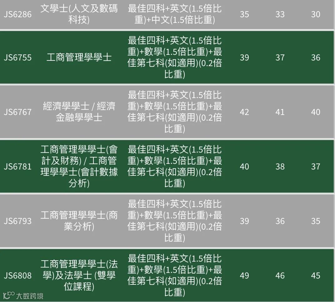 注意:换算成裸分的话中英数通+两门选修的455555*至455554的水平,平均每科有5分左右。另外注意港大商科必须DSE英文科达4分。