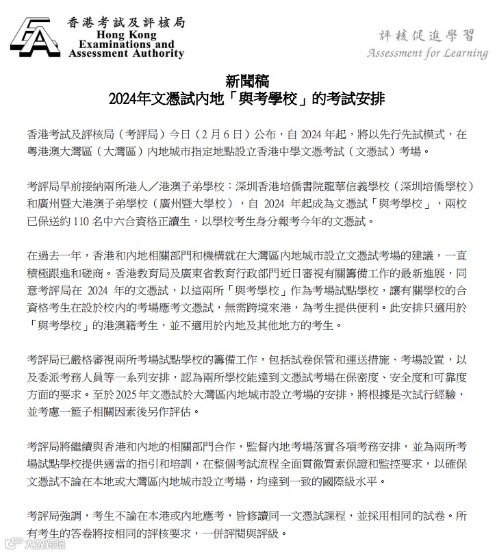 在过去一年,香港和内地相关部门和机构就在大湾区内地城市设立文凭试考场的建议,一直积极跟进和磋商。香港教育局及广东省教育行政部门近日审视有关筹备工作的最新进展,同意考评局在2024年的文凭试,以这两所“与考学校”作为考场试点学校,让有关学校的合资格考生在设于校内的考场应考文凭试,无需跨境来港,为考生提供便利。此安排只适用于“与考学校”的港澳籍考生,并不适用于内地及其他地方的考生。