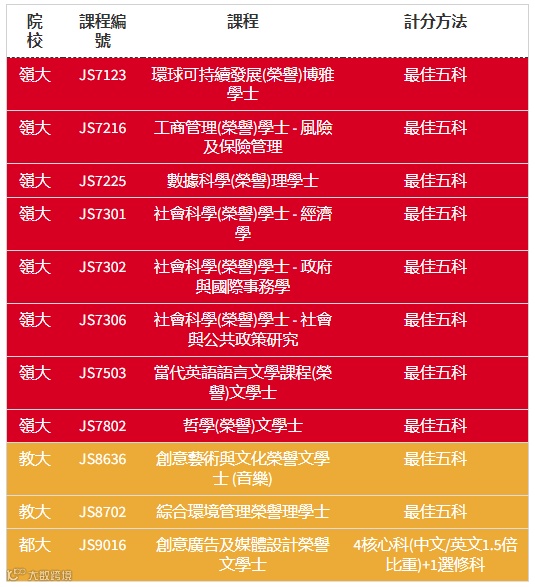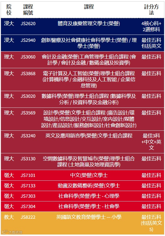 DSE 19分则有城大数据科学学院、浸大工商管理学士(荣誉)、理大酒店及旅游管理(荣誉)理学士、岭大工商管理(荣誉)学士等。