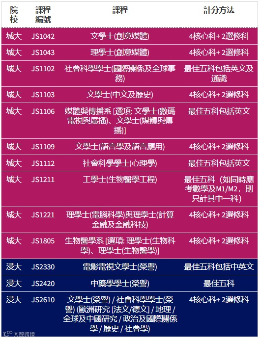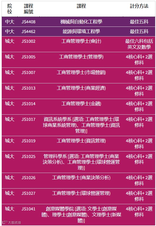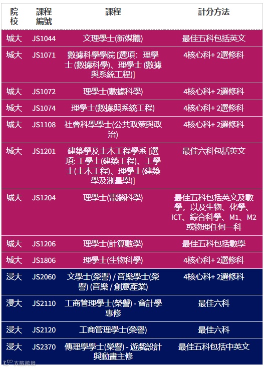 据去年入学收生数据,除了港大和科大外,其余院校均有课程的下四分位数为5科20分,其中包括中大机械与自动化工程学、能源与环境工程学、城大工商管理学士、浸大电影电视文学士、理大设计学文学士、教大7科教育学士课程等。
