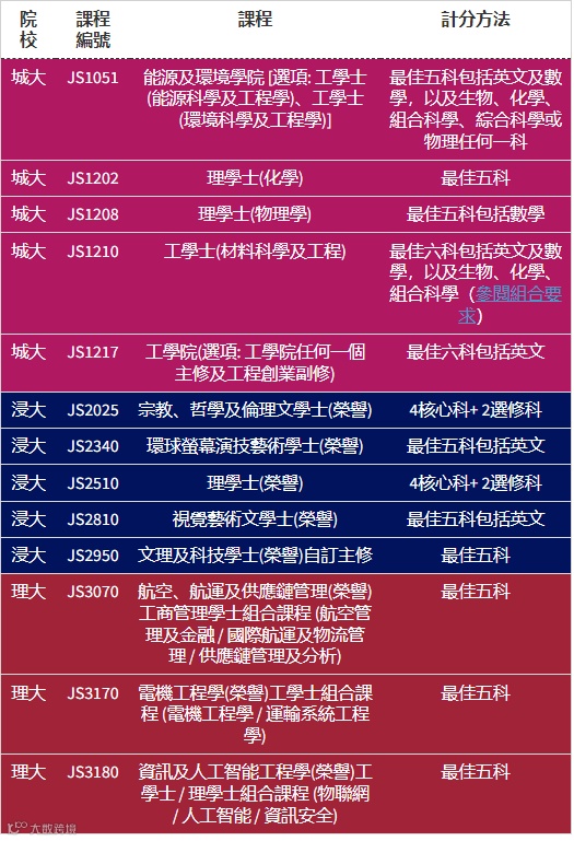 DSE成绩18分有城大工学院、浸大理学士(荣誉)、视觉艺术文学士(荣誉)、理大航空、航运及供应链管理(荣誉)工商管理学士组合课程等。