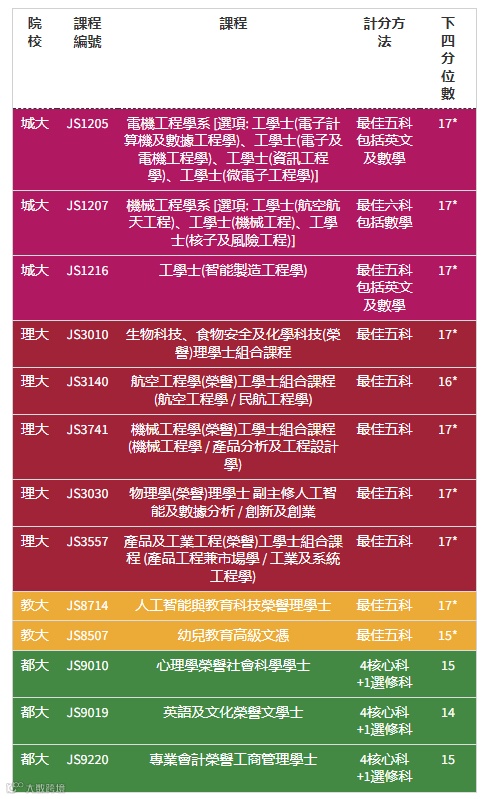 至于DSE成绩17分或以下,城大、理大、教大和都大亦有课程的下四分位数在13~17分之间,包括城大及理大机械工程学系、教大人工智能与教育科技荣誉理学士、都大14个课程等。