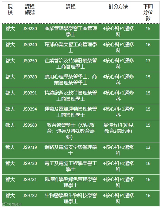 其中,都大英语及文化荣誉文学士下四分位数为14分,网路及电脑安全荣誉理学士为13分。
