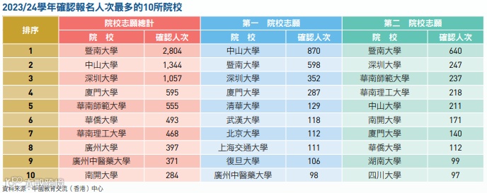 2023年确认报名人数最多的10所院校与2022年相比大体相同,报名人数最多的3所院校依然是暨南大学、中山大学和深圳大学。